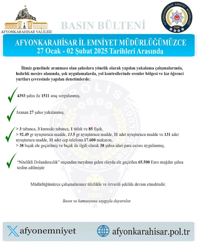 Afyonkarahisar Emniyet Müdürlüğü, vatandaşların huzur ve güvenliğini tehdit eden unsurlarla mücadeleyi öncelikli görev kabul etmektedir. Bu kapsamda yapılan operasyonlar,