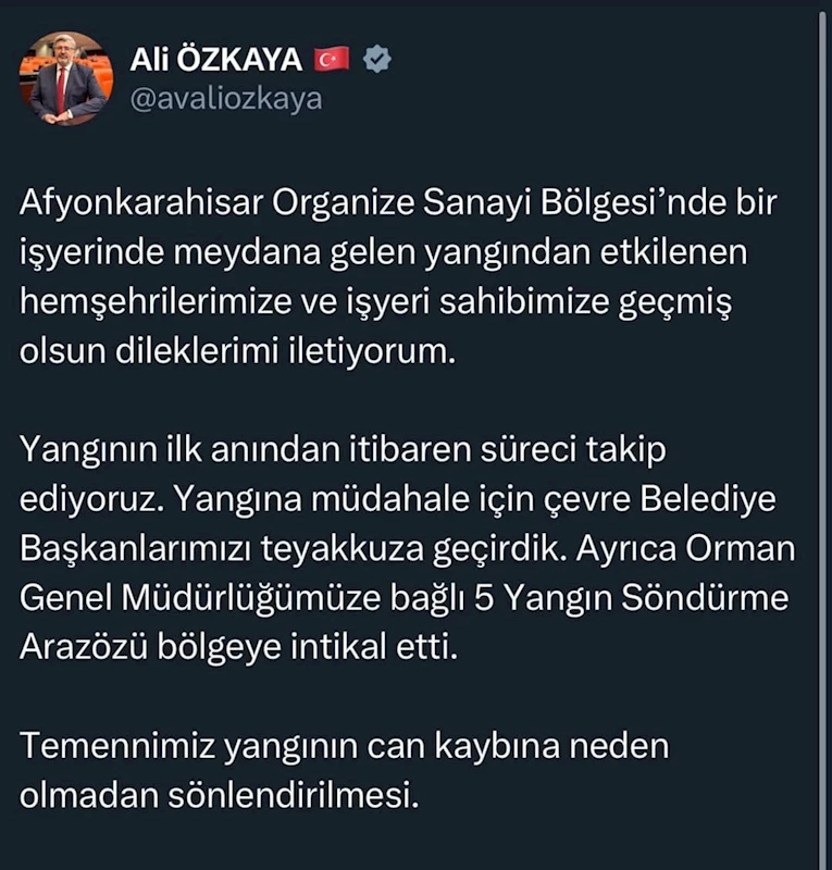 Afyonkarahisar Organize Sanayi Bölgesi'nde bir işyerinde meydana gelen yangın endişe yarattı. Yangından etkilenen işyeri sahibi ve tüm hemşehrilere geçmiş olsun dilekleri iletildi.